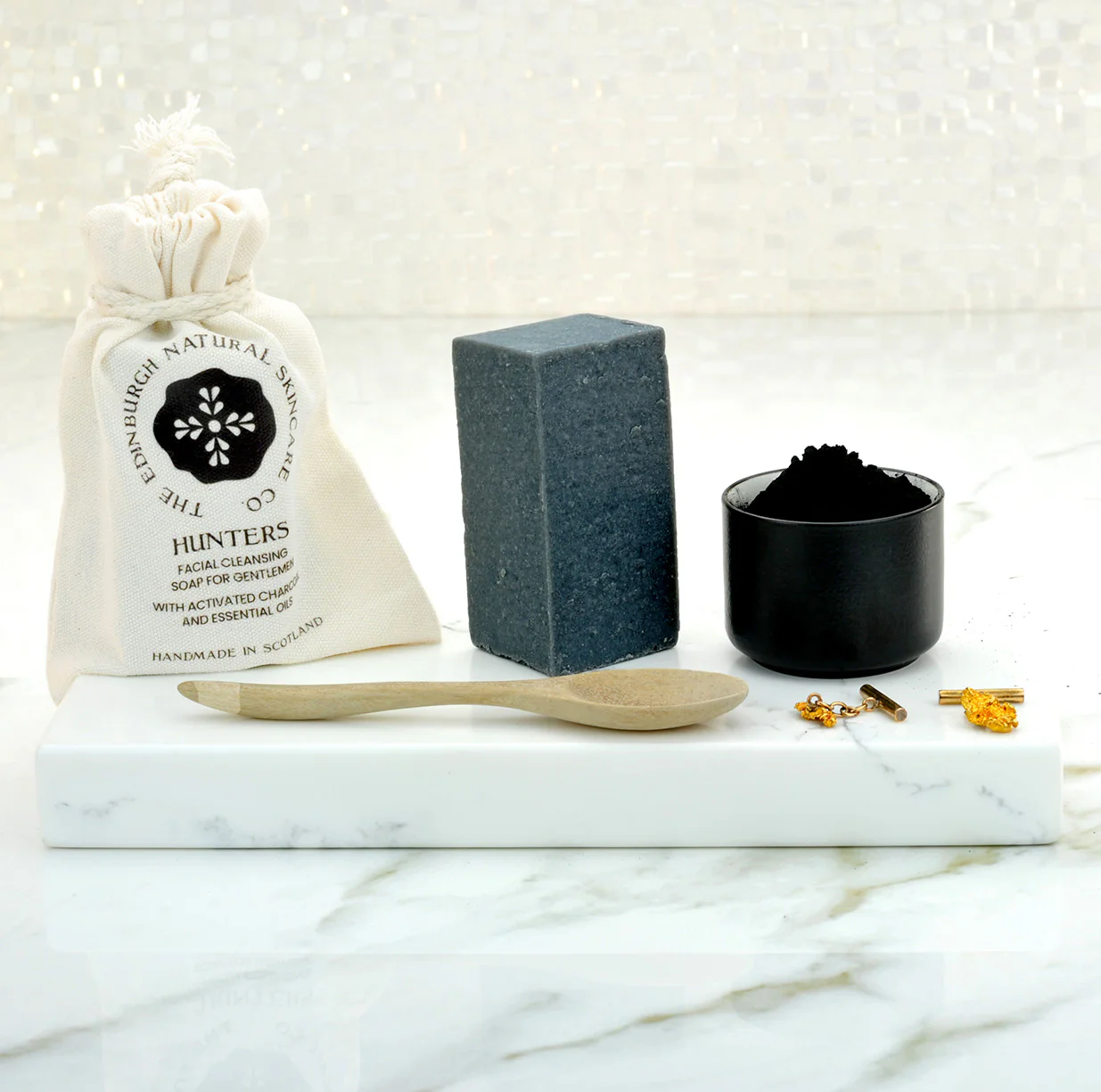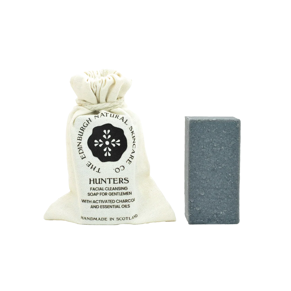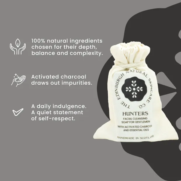 Hunter’s Facial Cleansing Soap er laget med kokosolje, olivenolje og bærekraftig palmeolje, kombinert med aktivt kull og utvalgte eteriske oljer.