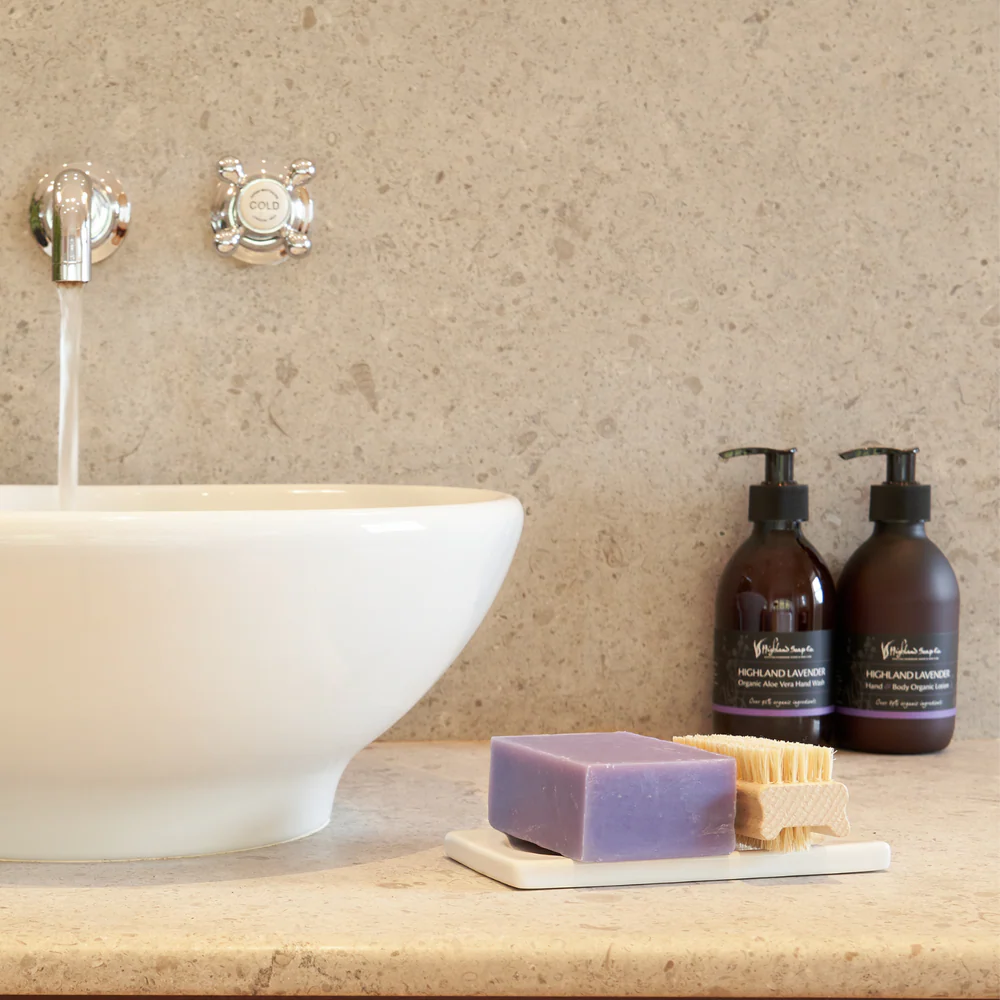 Sodium olivate (olivenfruktolje), Sodium cocoate (kokosnøttolje), Sodium palm kernelate (bærekraftig økologisk palmekjerneolje), Zea mays (maisolje), Aqua (vann), Butyrospermum parkii (sheasmør), Theobroma cacao (kakaosmør), Sodium castorate (ricinus-/castorolje), Lavandula officinalis (lavendelblomstolje), Lavandula officinalis (lavendelblomstekstrakt)*, Linalool, Geraniol, Limonene.
